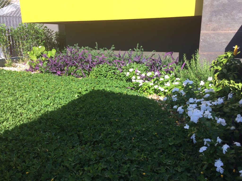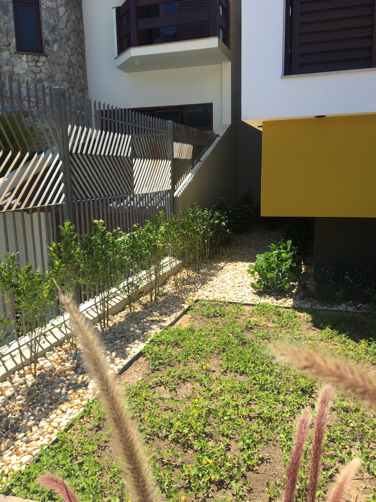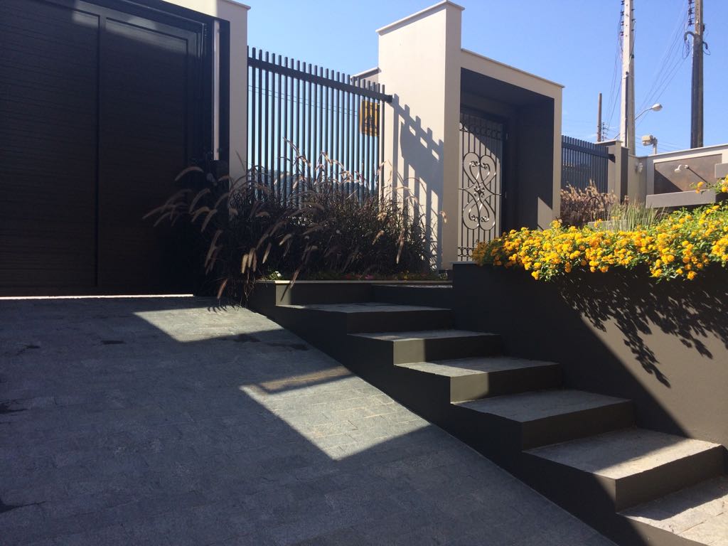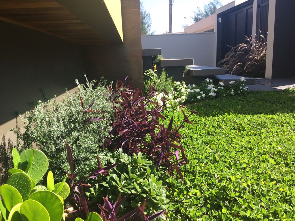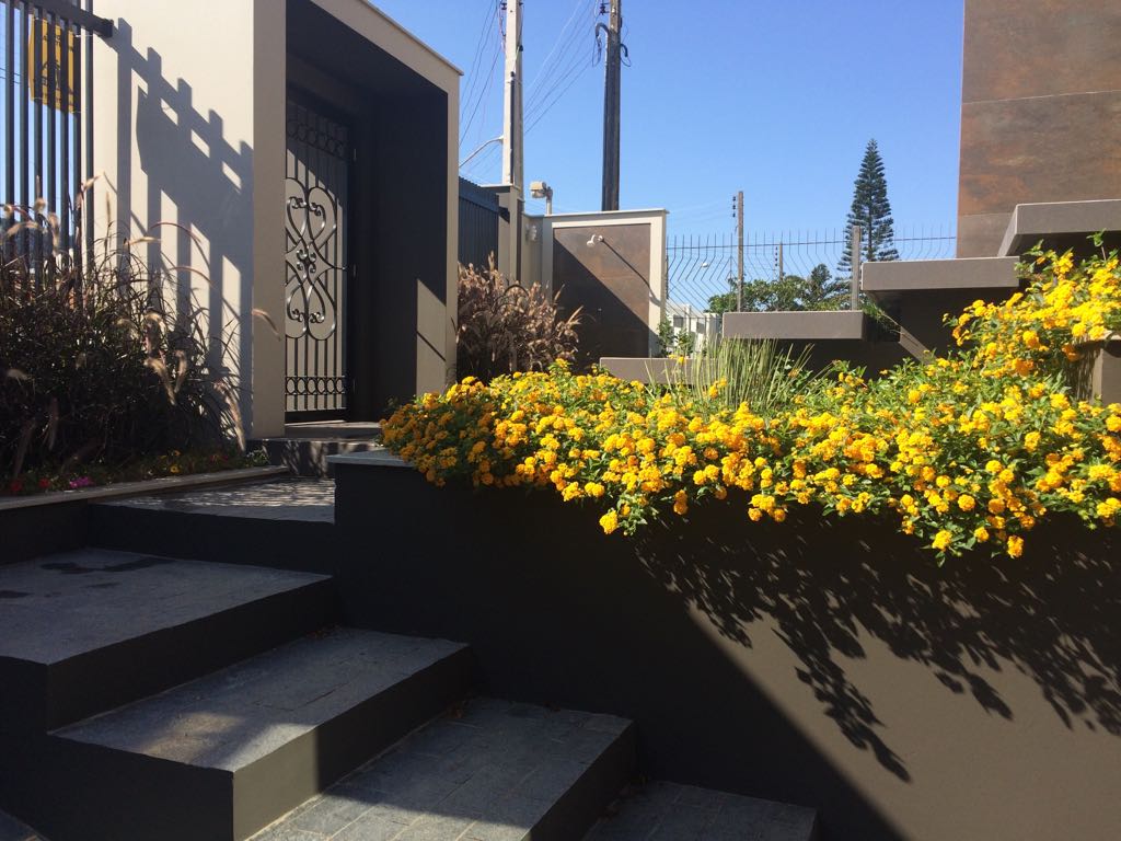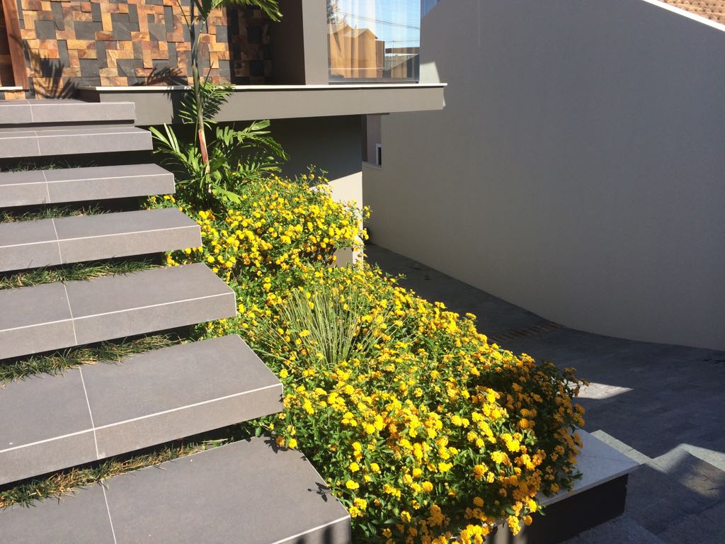 A arquitetura imponente precisava de um paisagismo que a contemplasse. Ao criarmos este projeto levamos em consideração o gosto do cliente pelo cultivo de flores. Escolhemos uma palmeira que valorizasse a fachada, com um caminho de dormentes rústicos e espécies que trouxessem suavidade. Além das flores, utilizamos espécies com tons de verdes diferentes, como a Bambusa textiles gracilis, Neomarica caerulea e a Pata de Elefante (Beaucarnea recurvara).